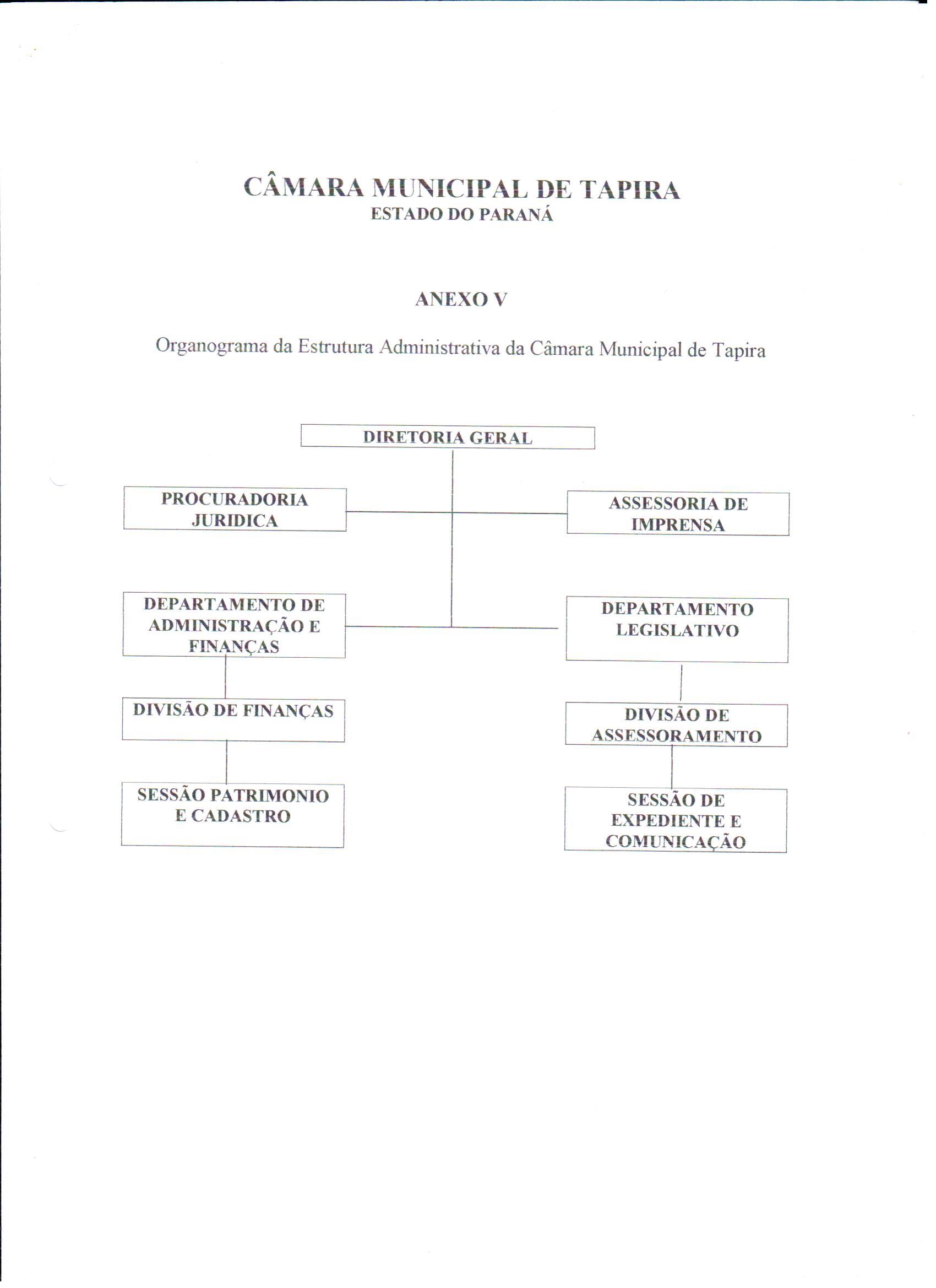 Diretoria Geral, Procuradoria Juridica, Assessoria de Imprensa, Departamento de Administração e Finanças, Departamento Legislativo, Divisão de Finanças, Divisão de Assessoramento, Sessão Patrimônio e Cadastro, Sessão de Expediente e Comunicação